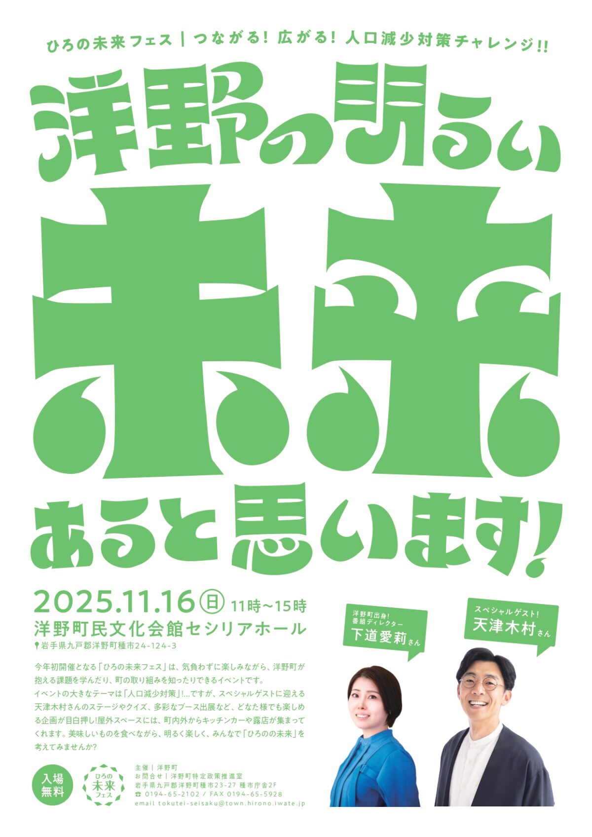 令和7年11月16日(日)開催予定の「ひろの未来フェス」PRキャラバン隊の様子が、下記の通りテレビ放送されます。 ・放送局 IAT(岩手朝日テレビ) ⑴番組名 スーパーJチャンネルいわて ⑵本日 10…