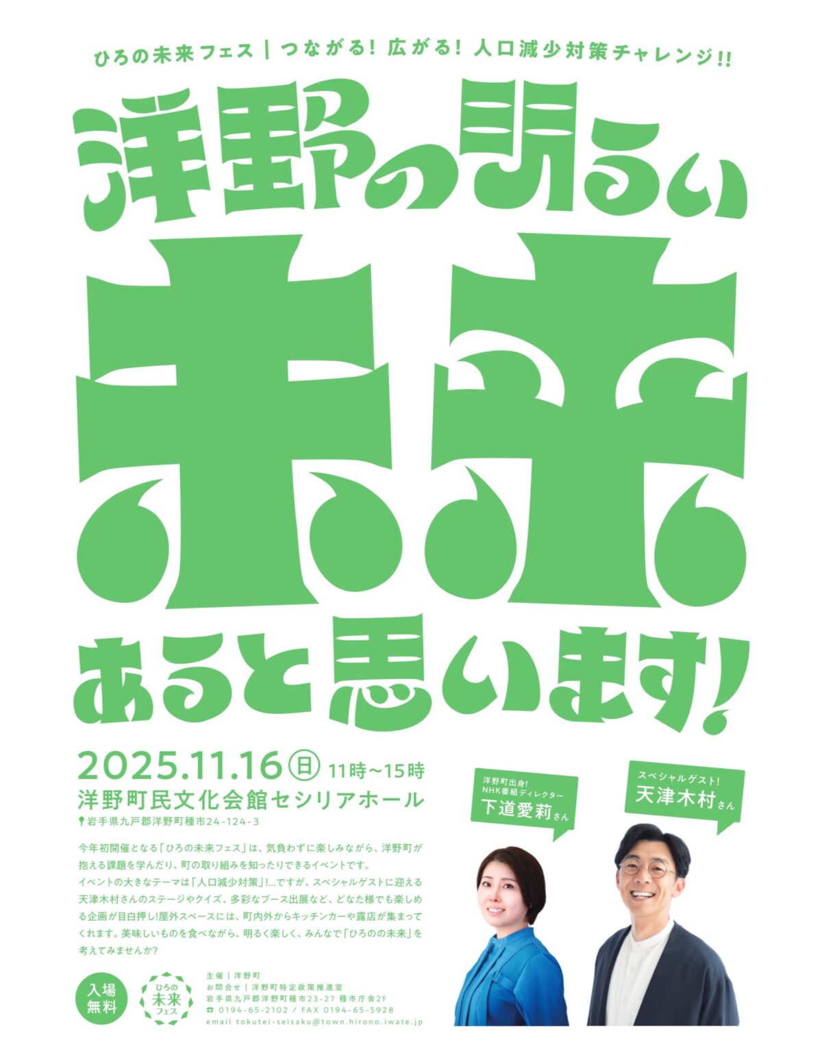 ホーム 洋野町の声 VOICES 洋野町の声 洋野町 国保種市病院 健康講演会を開催します 国保種市病院では毎月健康講演会を開催しています。 10月は当院の蝦夷森理学療法士を講師に講演会を開催します。 どなたでも無料で参加できます。みなさまぜひご参加ください。 〇日時… 投稿日時:2025.10.22 続きを見る 洋野町 洋野町特定政策推進室 11.16(日)『ひろの未来フェス~つながる!広がる!人口減少対策チャレンジ!~』開催決定 スペシャルゲスト:天津木村! MC:洋野町出身NHK番組ディレクター:下道愛莉! 会場:洋野町民文化会館セシ… 投稿日時:2025.10.21 続きを見る ユーザー やませ丸 今日のお昼は久々におおのキャンパスの赤鶏ラーメン🍜半チャーハンセットと迷いましたが+梅おにぎり🍙を選択。何度でも食べたくなる奥深い味わいです! 投稿日時:2025.10.17 続きを見る 事業者 アンテナ株式会社 お打ち合わせで大野に来ていました。寒くはなってきましたが、日中は遠足日和な気温ですね。園児や学生さんがバスで遊びにおおのキャンパスへ来ていました♪青空の下でワイワイ賑やかでパワーを頂きました! 投稿日時:2025.10.15 続きを見る ユーザー たかはし ふるさと納税で頼んだおおのミルク村のヨーグルトが届きました! イラストも可愛いし、包装も丁寧で嬉しいです!食べるのが楽しみです😊 投稿日時:2025.10.11 続きを見る 事業者 ヒロノット~洋野町にぎわい創造交流施設~ ワクWORKスクール3〜デジタル遊園地inヒロノット〜、本日イベント2日目を開催中です!昨日も大盛況だったeスポーツ「HADO」をはじめ、謎解きイベントも自由に楽しめます。 謎解きイベントのクリア証明… 投稿日時:2025.10.05 続きを見る ユーザー AoHaRu22 デジタル遊園地inヒロノットに行ってきましたよ! 息子は9時から16時まで7時間HADO(ハドー)を満喫。 HADOに取り憑かれた息子は景品のHADOTシャツ(ハドティー?)をGET! めちゃくちゃ楽… 投稿日時:2025.10.04 続きを見る 事業者 ヒロノット~洋野町にぎわい創造交流施設~ ヒロノットで「ワクWORKスクール3〜デジタル遊園地inヒロノット〜」を開催中です!本日4日と明日5日の2日間。時間は9:00〜17:00です。 写真はeスポーツ「HADO」の様子。謎解きイベントなど… 投稿日時:2025.10.04 続きを見る 事業者 アンテナ株式会社 本日は大野高校様で動画編集についての講義をさせて頂きました!いきいきとして目の輝きが素敵な生徒さんの前で緊張しましたが、とても真剣に、そして楽しんで聞いて下さいました♪次回もあり、制作課題も出しました… 投稿日時:2025.10.03 続きを見る 洋野町 国保種市病院 健康講演会を開催します 国保種市病院では毎月健康講演会を開催しています。 9月は青木歯科医院の青木一先生を講師に講演会を開催します。 どなたでも無料で参加できます。みなさまぜひご参加ください。 〇日時… 投稿日時:2025.09.24 続きを見る 事業者 アンテナ株式会社 こんにちは。10/4.5ヒロノットにて「デジタル遊園地inヒロノット」が開催されます!大人気eスポーツ「HADO」が昨年より更にパワーアップして帰ってきました!今年は朝から夕方まで終日遊べるのと、ミニ… 投稿日時:2025.09.24 続きを見る ユーザー やませ丸 今日は役場近くの公園「しおかぜパーク」のバスケットコートで3×3の大会が開かれていました。天気も良く、選手たちの好プレーに観客から声援が送られていました。こういうスポーツイベントがもっともっと増えれば… 投稿日時:2025.09.23 続きを見る 123>»