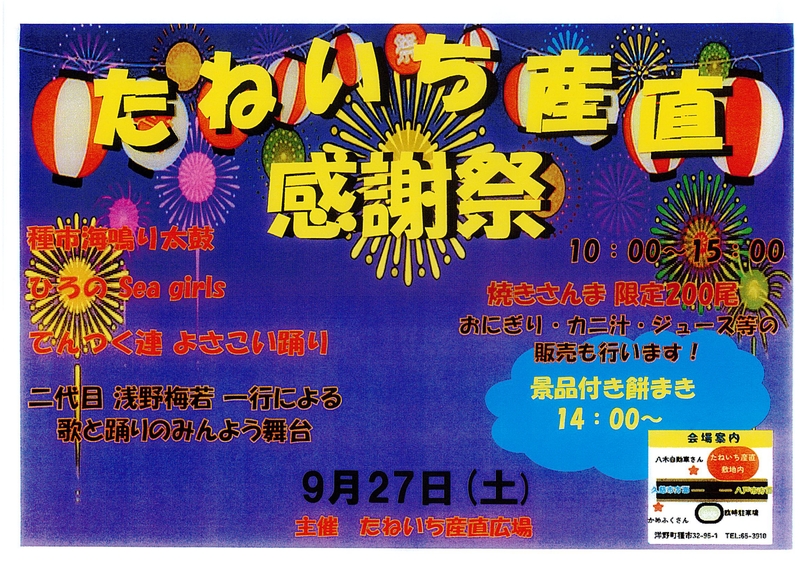 たねいち産直ふれあい広場において、下記のとおり「たねいち産直感謝祭(主催:種市地域食文化伝承交流施設運営協議会)」が開催されますのでお知らせします。