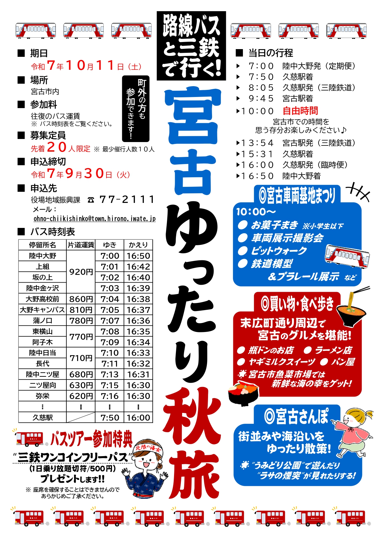 路線バス久慈大野線の利用促進を図るため、「路線バスと三鉄で行く!宮古ゆったり秋旅」を実施します。