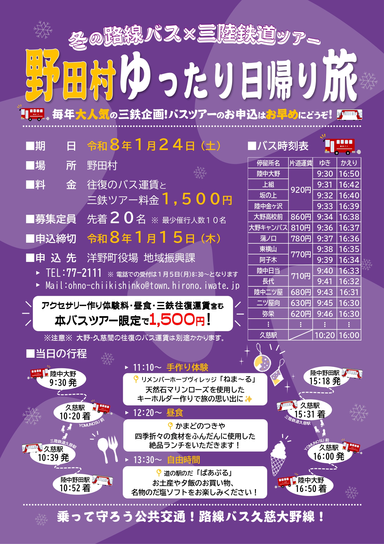 路線バス久慈大野線の利用促進を図るため「野田村ゆったり日帰り旅」を実施します。毎年人気のバスと三鉄で行くツアーです。参加申込は役場地域振興課まで。詳しくは添付のチラシをご覧ください。