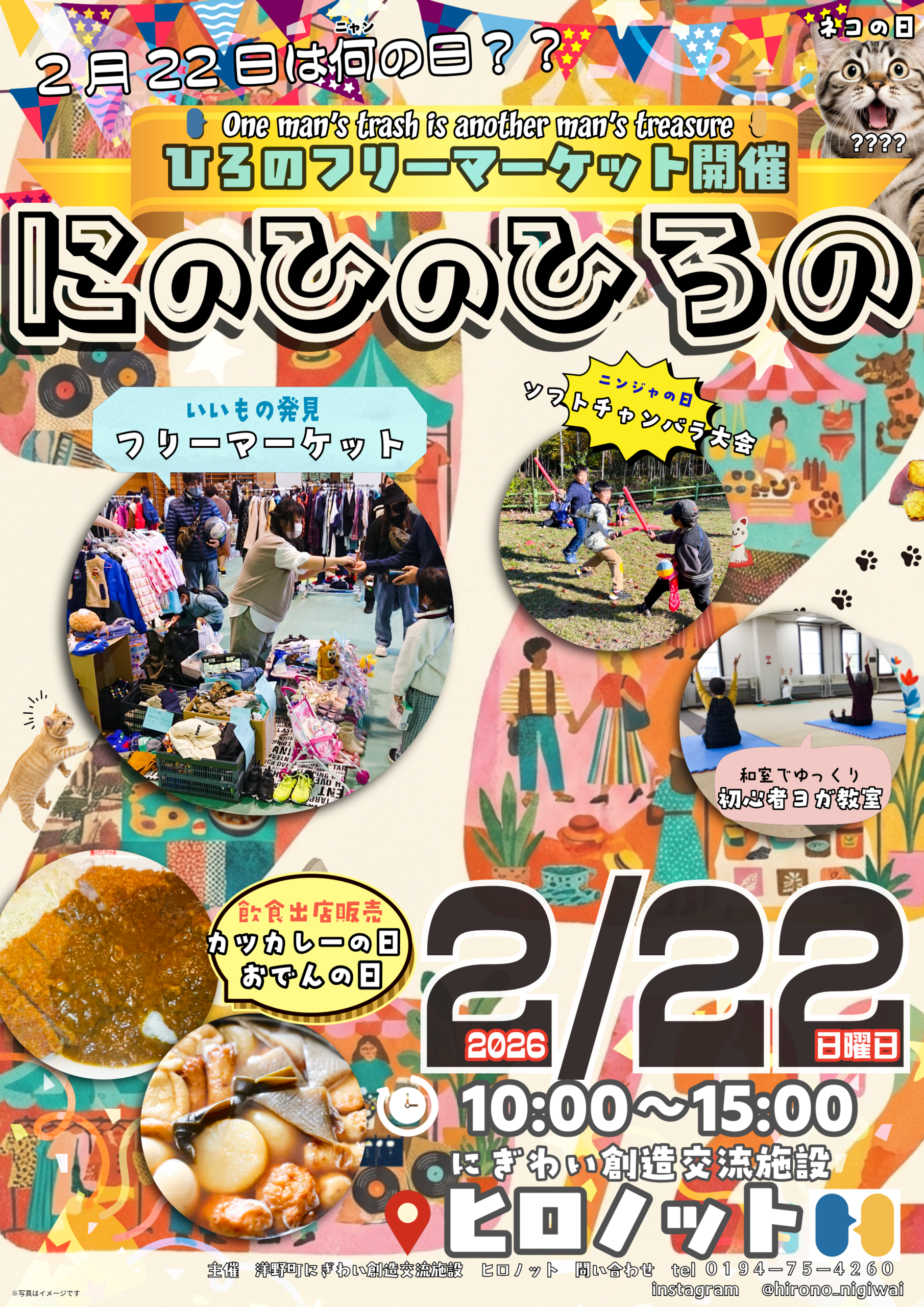 ☆☆☆フリーマーケット出店希望・ヨガ教室参加希望は、ヒロノットInstagramのハイライト「にのひのひろの」内のリンクか、ひろのポータルサイト内のお知らせ記事からご応募・またはヒロノットにお問い合わせ下さい☆☆☆