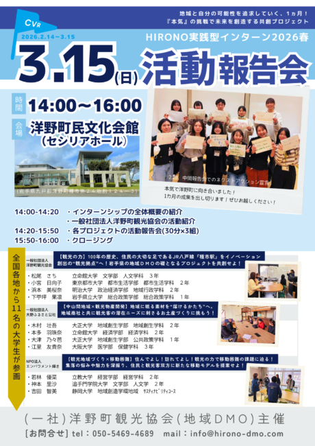 令和8年3月15日(日)、『HIRONO実践型インターン2026春 活動報告会』を開催します。