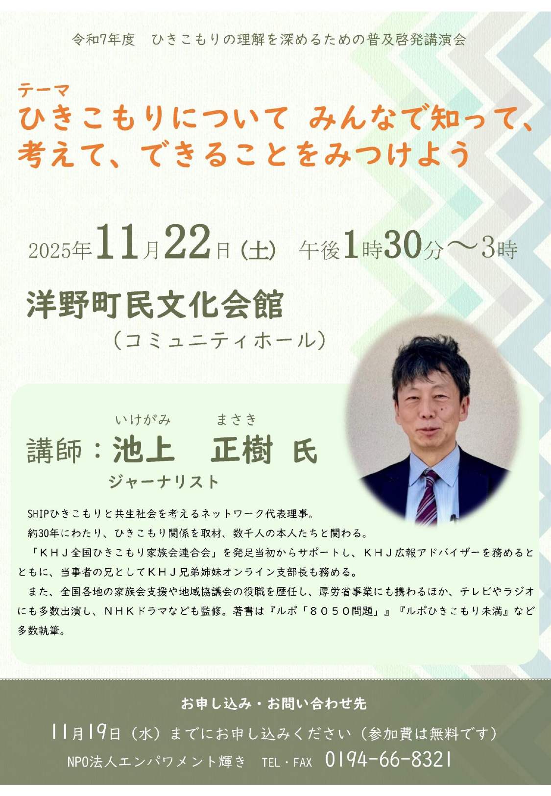 ひきこもりに対する理解を深め、現在、ひきこもりに悩む人が相談しやすい環境を整えることを目的に、地域で支え合うきっかけづくりの一環として、下記のとおり講演会を開催します。