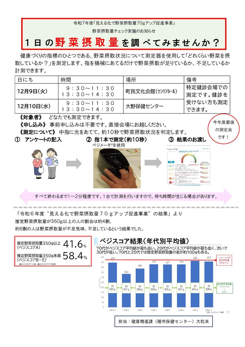 事前申し込みは不要で、どなたでも受けることができますので、この機会にぜひ1日の野菜摂取量を測ってみませんか?