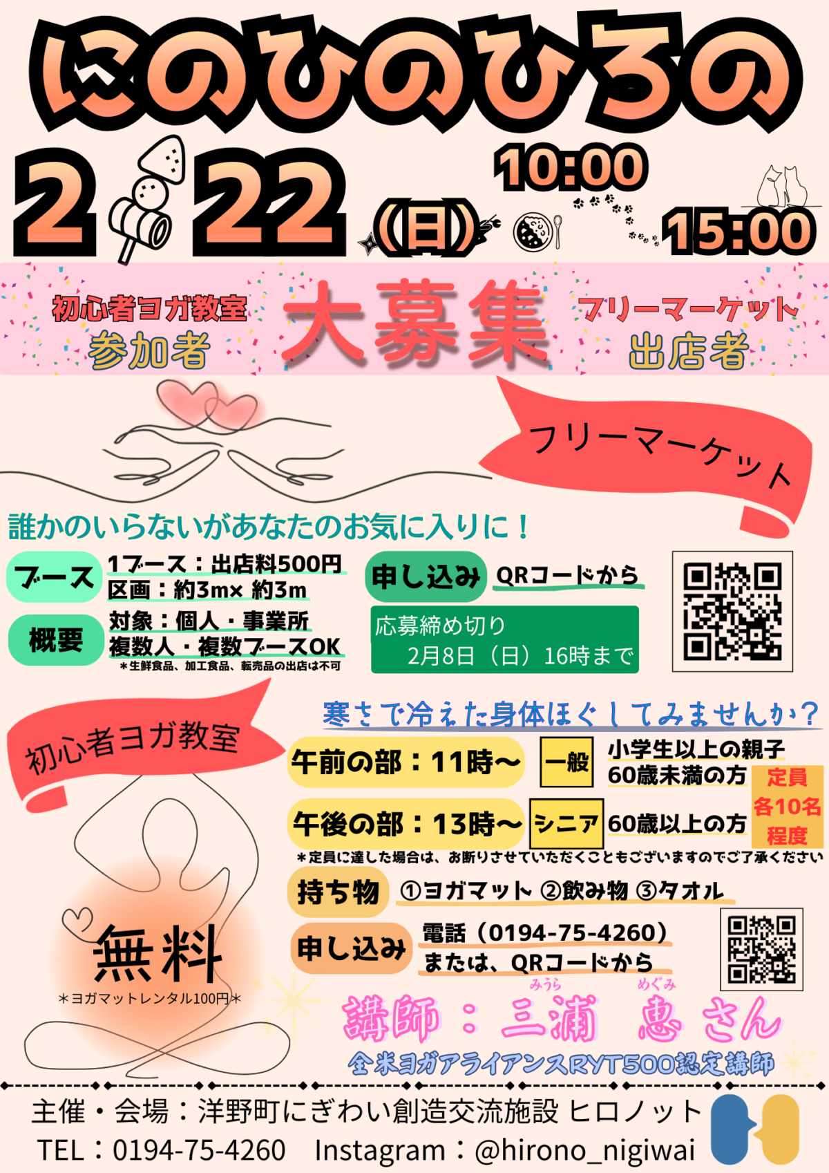 ホーム 洋野町の声 VOICES 洋野町の声 ユーザー ムギちゃん 鳴雷神社 どんと祭!2026 鳴雷神社で毎年行っている行っている、どんと祭を今年初めて見に行くことが出来ました!厳かな雰囲気の中で行っていました。良かったら動画を見てください。 投稿日時:2026.01.26 続きを見る 洋野町 洋野町特定政策推進室 町主催の「スパルタキャンプ」が本日からヒロノットでスタートしました!岩手県八幡平市で誕生した人気コンテンツで、全8回の短期集中型の学習キャンプでプログラミングを学習します! かなり専門的な講義内容でし… 投稿日時:2026.01.24 続きを見る 事業者 ヒロノット~洋野町にぎわい創造交流施設~ 【イベント参加者・出店者の募集✨】 ヒロノットで「2.22(”2(に)”の日)」にちなんださまざまな催しものをやります🎉 そこで、このイベントで行う「フリーマーケット」の出店者と「初心者ヨガ教室」の参… 投稿日時:2026.01.23 続きを見る ユーザー ムギちゃん 洋野町消防出初式 分列行進 2026! 1月11日、新年恒例の洋野町消防の出初式を行いました。良かったらその時の様子を見てください 投稿日時:2026.01.18 続きを見る ユーザー 洋野のONIISAN あけましておめでとうございます。本年もよろしくお願いいたします。何やら今年は一部地域で十年に一度の大雪になる地域があるとか。近頃雪が降ったり溶けたりを繰り返していますが、積雪時、朝5時頃には自宅前を除… 投稿日時:2026.01.16 続きを見る 事業者 アンテナ株式会社 少し前ですが、ヒロノットで作業をしていてふと外を見たら、きれいな虹がかかっていました。たまたま数日前に絵本を読んでいて、童心にかえり、虹の上を歩いて渡っている幼少期の自分や友達を想像していました。そし… 投稿日時:2026.01.16 続きを見る ユーザー ムギちゃん 今年も1月10日に帯島小学校で帯島地区のどんと祭が開催されました! 今年度で帯島小学校が閉校になるので、最後になるかもしれない児童たちによる、大渡えんぶり等の踊りをご覧ください 投稿日時:2026.01.15 続きを見る 洋野町 洋野町特定政策推進室 ヒロノットで町主催の「ビジネスづくり体験キャンプ」がスタートしました。参加したのは本町出身者を含む高校生や大学生。初日の今日は町のモヤモヤの中からビジネスのアイデアを定めるワークに取り組みました。 参… 投稿日時:2026.01.11 続きを見る ユーザー ムギちゃん 東北エモーションの運行再開を記念し、横断幕でお出迎え! 2025年12月8日に発生した地震で被災したJR八戸線が年末に全面復旧したことから、2026年1月9日に東北エモーションも運行再開!それを祝して… 投稿日時:2026.01.11 続きを見る 事業者 アンテナ株式会社 あけましておめでとうございます。皆様年末年始はゆっくり過ごせましたでしょうか。初日の出に寝坊し、ドタバタな年始を迎えてしまいましたが、本年も事業者様はじめ、関係者様のお役に立てるよう精進してまいります… 投稿日時:2026.01.06 続きを見る ユーザー ムギちゃん 2026年明けましておめでとうございます! 今年もよろしくお願いします! 2026年がめでたく開けました!元旦の初日の出の様子を見に行ってきました。残念ながら日の出は見る事出来ませんでしたが、今年もよ… 投稿日時:2026.01.01 続きを見る 事業者 アンテナ株式会社 降雪と路面凍結が本格的になってきましたね。さて、アンテナは本日で今年の営業が終了になります。来年は1月5日からの営業開始になります。お客様、関係者の皆様、本年も大変お世話になりました。新しい経験や気づ… 投稿日時:2025.12.29 続きを見る 123>»